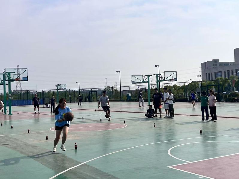 男生组以三分线外定点投篮为赛制,25名参与者每人10次投篮机会,在三分线外任意位置比拼准度,用篮球划出青春的抛物线;女生组聚焦罚球线投篮,25位“篮球女孩”轮流登场,10次机会里既有专注的瞄准,也有场边此起彼伏的加油,将科研里的“稳”劲儿搬上球场;混合组则以“2男2女”组队形式开展障碍运球接力赛——从底线出发,绕过5个障碍物后传递队友,全程考验默契与协作,跨年级、跨身份的组合在运球、传球间碰撞出温暖火花。