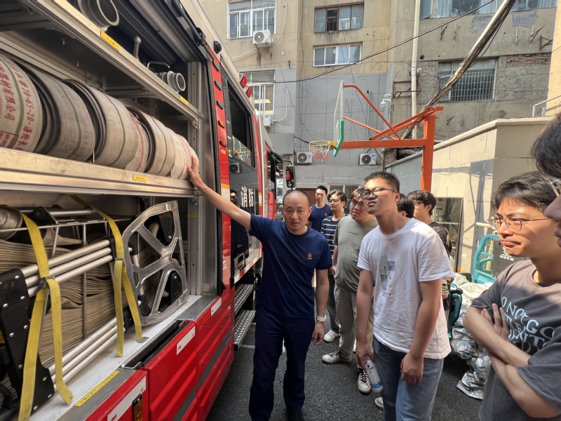 随后,消防救援人员带领同学们参观了各类消防救援车辆和消防救援装备,向他们介绍了不同救援车辆的用途。消防站长结合船海专业特性,对比讲解水上消防难点,学子们纷纷记录要点。消防站随即演示“水雾喷淋系统”模拟船舶灭火场景,研究生分组操作水带连接、战术配合,在实操中深化“防、控、逃”一体化认知。