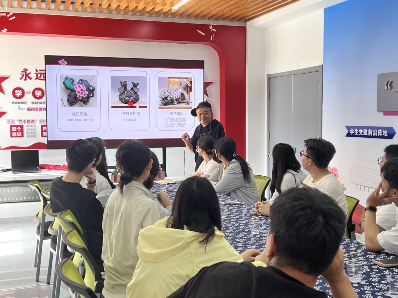 理论宣讲后,活动进入手作环节。周老师为同学们分发陶泥、刻刀等工具,并以“鱼化龙”为主题示范创作步骤:揉泥、塑形、刻画纹理……他熟练地揉泥、塑形,用刻刀在泥胚上勾勒出细密的鳞片纹理,再轻轻捏出龙首的棱角与龙须的弧度,一个活灵活现的“鱼化龙”雏形便跃然手上。细腻的手法与专注的神态,让在场师生直观感受到“匠人精神”的内核。同学们跃跃欲试,从揉泥定型到细节刻画,逐步投入创作。2024级土木水利专业员工赵闯专注地调整着鱼身的弧度:“原以为捏出鱼的形态很简单,结果既要保持泥胚的稳定,又要让龙首的神态‘立’起来,每一步都需要耐心和巧劲。”值得一提的是,回族员工马千禧在鱼身尾部融入了回族传统服饰中的“盘扣”纹样,龙首的鬃毛则以回族刺绣的“平针”手法为灵感,细腻的设计让作品兼具传统泥塑的厚重与民族文化的灵动。