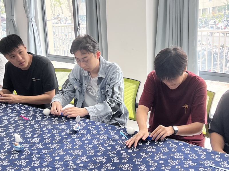 9月25日,活动在“蓝途”一站式员工社区热烈开场,活动由黄妍老师主持。陈斌老师首先展示了精湛的面塑技艺,从传统人物造型到现代创意作品,生动展现了非遗面塑的艺术魅力。随后,他结合学校特有的“船魂”精神,引导同学们以“同心船”为主题进行创作。在陈老师的示范指导下,同学们纷纷动手实践,通过揉、捏、搓、刻等手法,将各色面团塑造成一艘艘寓意深远的船只。现场气氛活跃,不同民族、地区的同学们在创作过程中相互交流技法、分享创意,展现了多元文化的交融互鉴。