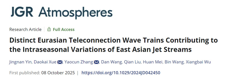 Yin, J., Xue, D., Zhang, Y., et al. (2025). Distinct Eurasian Teleconnection Wave Trains Contributing to the Intraseasonal Variations of East Asian Jet Streams. Journal of Geophysical Research: Atmospheres, 130(19), e2024JD042450. https://doi.org/10.1029/2024JD042450