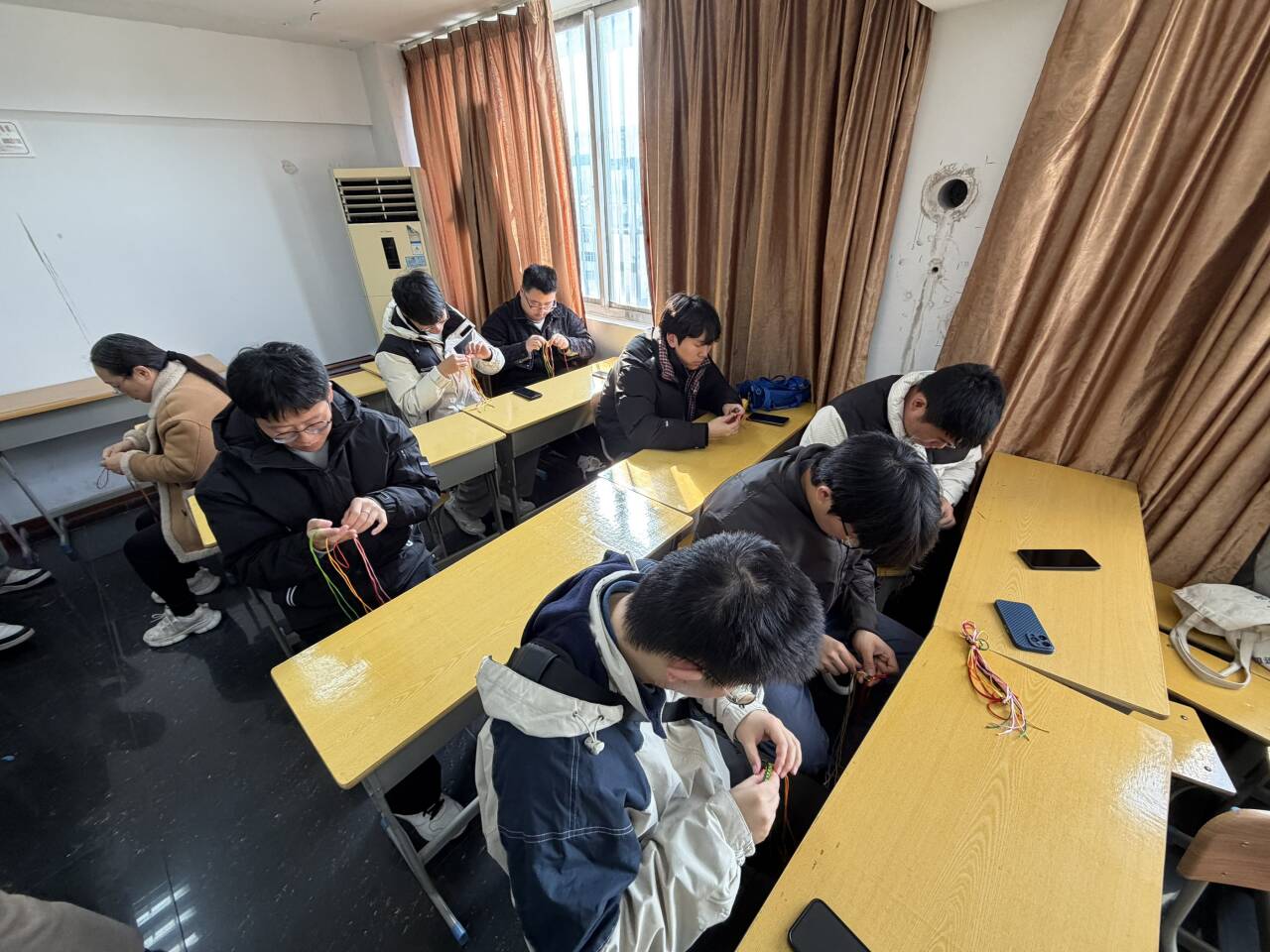 活动现场,安永凤老师首先介绍了中国结的历史渊源与文化内涵,从远古时期的“结绳记事”到如今的吉祥配饰,一个个形态各异的绳结承载着中华民族千年的文化记忆。随后,安老师围绕平结、吉祥结、盘长结等基础结型,逐一演示编织步骤与技巧,耐心讲解绳结编织的“一绕、一穿、一抽”核心要领。同学们手持红绳,跟随老师的指导一步步操作,从最初的绳线缠绕杂乱,到逐渐掌握编织技巧,经过一个多小时的创作,一个个造型饱满、寓意吉祥的中国结在同学们手中相继完成。看着自己亲手编织的作品,大家纷纷表示真切感受到了传统技艺的精妙之处。